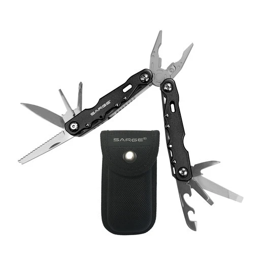 - 14 tools: Spring-loaded needle nose pliers, traditional pliers, hardened steel wire cutters, wire strippers, saw, awl, can opener, bottle opener, wood/metal file, phillips screwdriver, flat-head screwdriver, small flat-head screwdriver, knife blade and fish hook remover